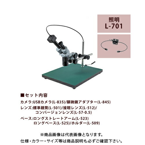 【メーカー名】 ●ホーザン(株) 【特長】 ●USBカメラ付き固定倍率式顕微鏡 【セット用品】 ●L-835 USBカメラ ●L-845 顕微鏡アダプター ●L-501 標準鏡筒 ●L-512 接眼レンズ ●L-57-0.5 コンバージョンレンズ ●L-509 ホルダー ●L-523 ロングストレートアーム ●L-525 ロングベース ●L-701 照明 【仕様】 《カメラを使用した場合》 ●倍率:11〜165X ※24インチワイドモニター使用時、解像度1920×1080設定時の倍率 ●視野:15×11〜4.2×3.2mm ●作動距離:145〜90mm ●撮像素子:1/2.5" CMOSイメージセンサ ●出力コネクター:USB2.0 ●有効画素数(最大):2592×1944(500万画素) ●保存画素数(最大): 静止画 2592×1944(500万画素) 動画 1280×960(120万画素) ●フレームレート:最大30fps 但し500万画素使用時のみ10fps ●動作環境:Windows 10 / 8 / 7 / XP ※日本マイクロソフト社のサポートが終了したOSでご利用中に問題が発生した場合の保障・サポート対応は行っておりません。
