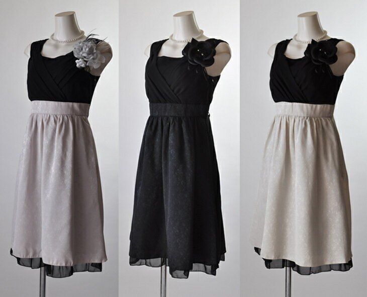 上身頃黒×下身頃ピンクベージュドレスはピンクボレロ、パール調アクセサリー付二重生地ベージュボレロ、マラボー付きベージュボレロの3パターン。
