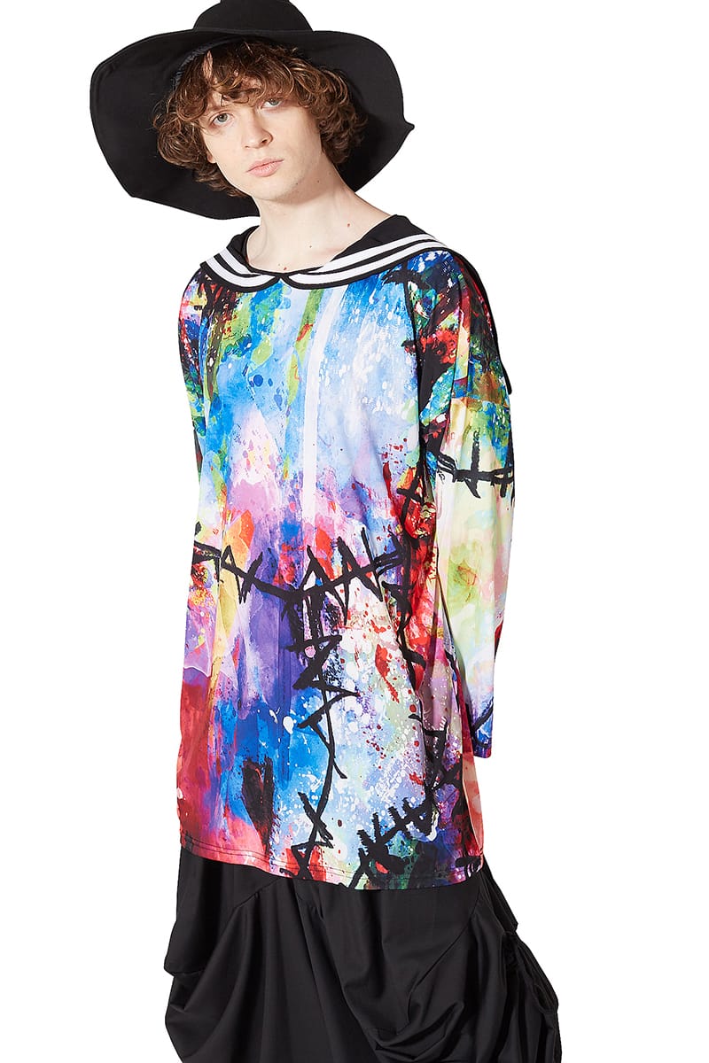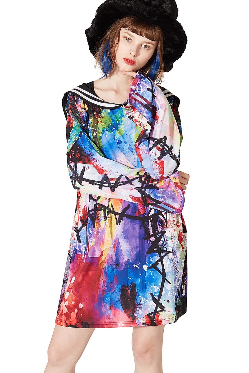 オーバーサイズ/ビッグシルエットを生かして女の子はワンピースとしても◎カラフルな色味でロマンティックに表現した完全体ゾンビの皮膚総柄がマッドポップ。